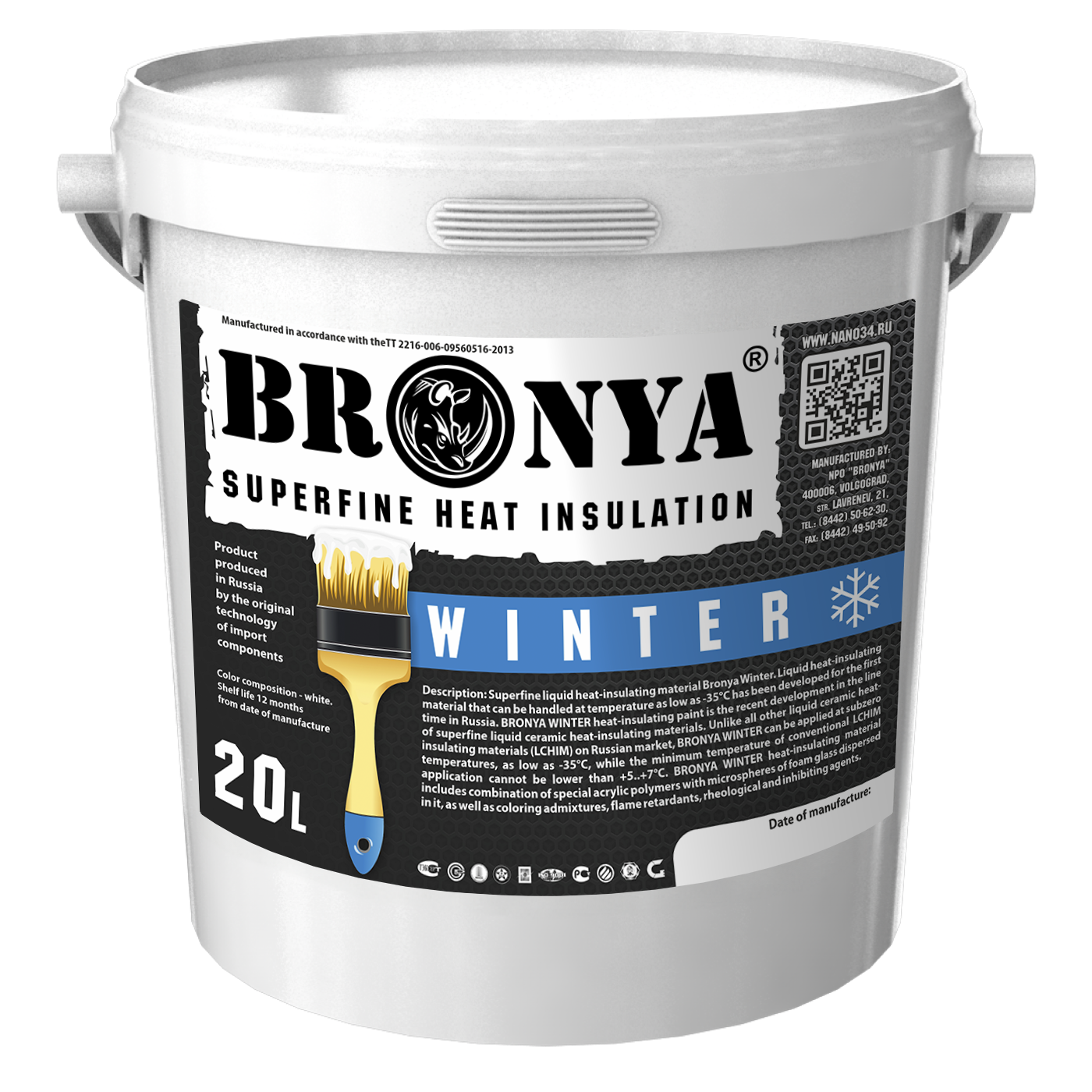 A Bronya Winter speciális fejlesztésű hőszigetelő bevonat, amely lehetővé teszi a kivitelezést extrém hideg időjárási körülmények között is, akár -35 °C-ig.